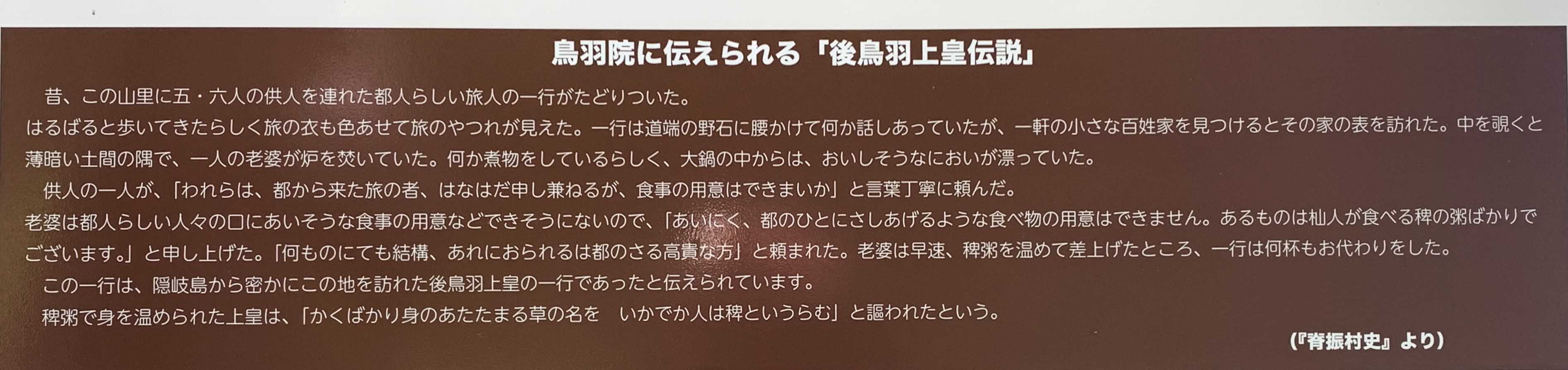 この鳥羽院地区には、鎌倉時代の1221年「承久の乱」で敗れ、隠岐島に流された後鳥羽上皇が、ひそかに島を抜け出して身を寄せたという「後鳥羽上皇の伝説」があり、鳥羽院という地名の由来にもなっている。毎年2月22日の「後鳥羽上皇」の命日には、現在でも祭事が行われているとのことである。