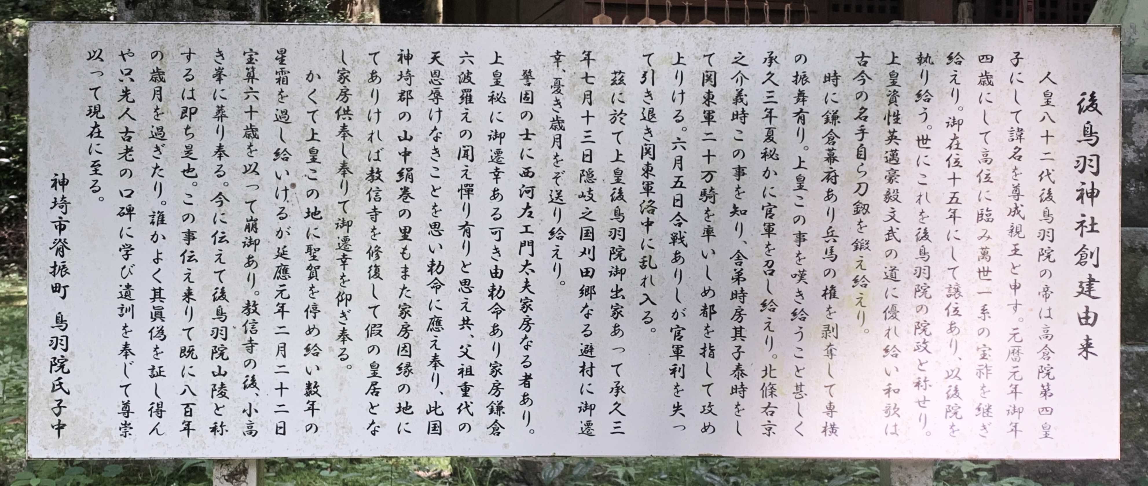 そして上の画像は、当社の由緒を撮影したもので、どのような経緯で「後鳥羽上皇」の御一行が、隠岐島から当地に身を寄せることになったのか、その背景が詳しく記されている。