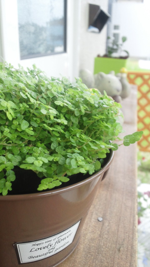 玄関外の台に、セリアで買ったブリキバケツにセット。