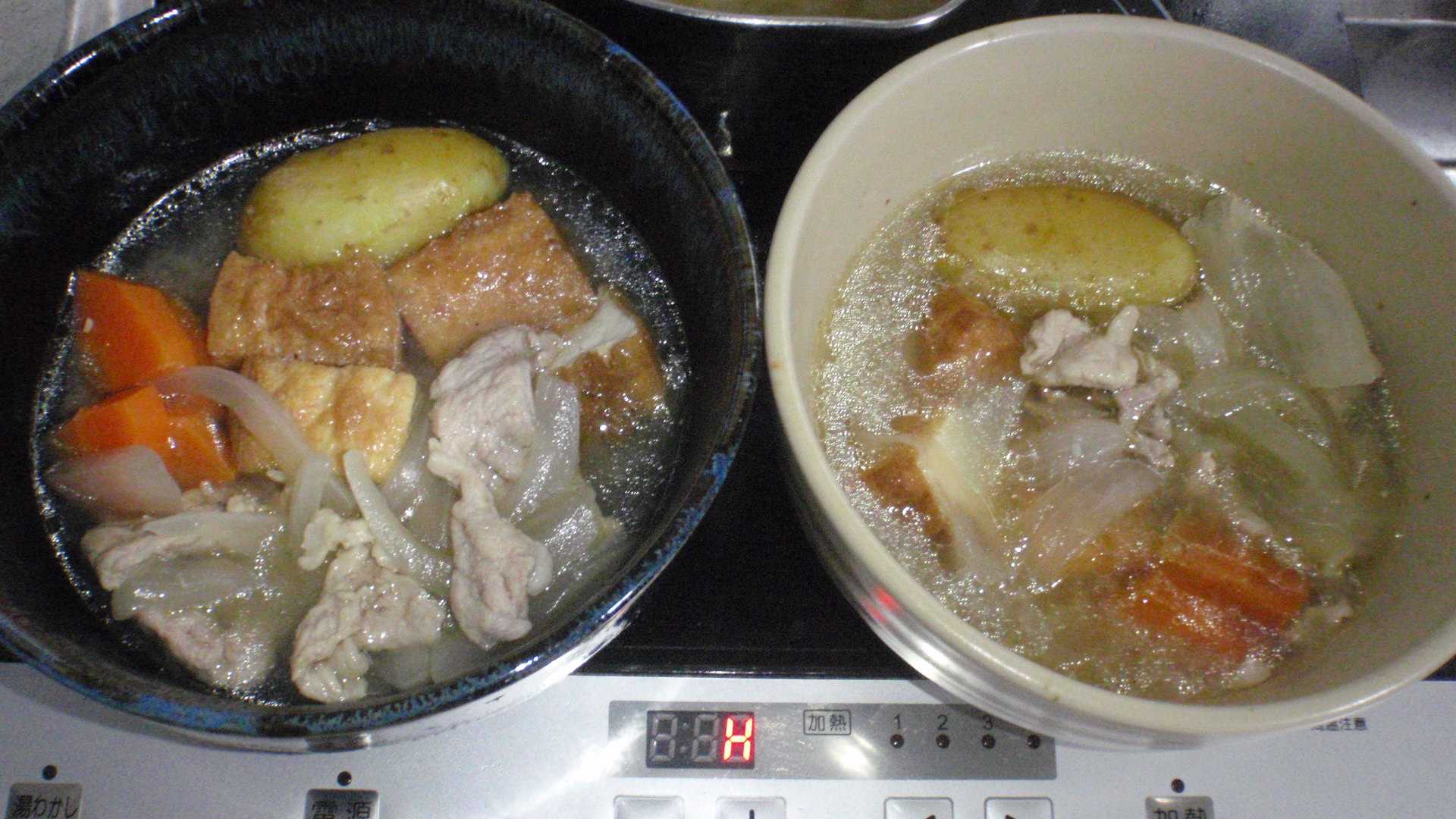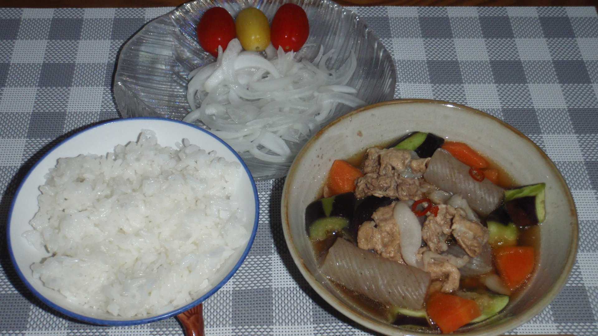 今週はあと10km走らなければならないが、この猛暑ならば朝一が一番涼しくて走りやすいので、昨夜から今朝は走る気満々だった。ところが朝起きると若干頭が重い。たぶん夜も暑くて熟睡できていないからだと思う。そんな状態で走って人さまに迷惑を掛けてもいけないので、朝は走るのをあきらめてとっとと朝飯を食う。朝飯を食うと頭が痛かったことも忘れたので、その程度の不調だったということだ。走るのを夕方まで引っ張るとずっと気持ちが重いので、10時前に走り出し、そこそこ暑かったが曇っていて陽射しがない分ましで、なんとかノルマの10Kmだけを走って来る。さて、昨日はブログを書く間もなく沈したが、小じゃがいもに一箱いただいたタマネギ、そしてニンジンももう少し残っていた。この食材でカレーを作ったり肉じゃがを作ったりしてきたが、あとはもう豚汁くらいしか思いつかなかった。これだけ暑いのに豚汁?という気もしたが、昨日は走らなくてもいい日なので、エアコンが効いた部屋で豚汁を作る。これは昨日の画像ね。昨日今日の2食分を作ったが、この時期なので今日の分も器に取り冷蔵庫で管理していた。いつも書いているが、豚汁ってみそ汁なのでメインのおかずにはなり得ず、もう一品必要なのだがオニスラときゅうりの輪切りに、サラダチキンを混ぜたサラダ。父が作ったきゅうりは種が多くなり、そろそろ終わりのようだ。