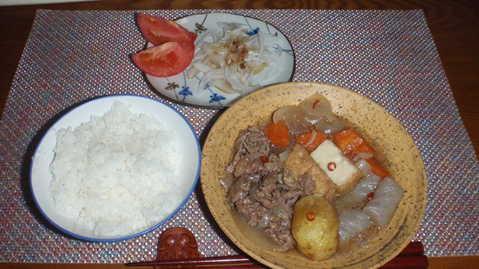 土曜日だというのに今週はまだ14kmも走らなければならない。冬の14kmならば軽く一回で(本当か?)走る距離だが、この時期のそんな距離を走ると命にかかわる。とりあえず昨日の10kmに引き続き、今日も朝から10Kmだけ走ってきた。今日は休日なので、昨日よりも30分遅く6時に走り出したが、7時近くなるともう暑くてへろへろになる。あと4Kmなので今日頑張って走っておけばいいのにと思われるかもしれないが、夕方になって若干熱中症気味かなと思う頭の重さだった(痛さではない)。まあ、この程度ならば一晩寝れば、明日の朝には残り4kmを走れるけれどね。さて、ニンジンがダブついている。ニンジン1本を買うと最後には必ずダブつく。初めから使い切る気ならばニンジンシリシリとかを作るが、少しずつ使っていくと毎回微妙に残る。ニンジンがダブついている、小じゃがいもといただきもののタマネギの在庫があるというところから考えられるメニューは、カレーか豚汁に肉じゃがしか思い浮かばないが、今日は国産(←ここ大切)牛の切り落としとねじりコンニャクに厚揚げまで買って来たので、カレーという選択肢はなく、ましては牛汁(豚汁の牛バージョンのことね)というのは検索すればレシピはありそうだがイメージできず、牛肉じゃがになる。もちろん小じゃがいもは皮を剥かずに表面を軽くこすった程度。みりん10ccに砂糖を加えて、俺史上最大の甘めに振ってみた。昨日切ったオニスラに削り節と減塩ポン酢を掛けて、トマトを添えた生野菜。どうでもいい話だが、今朝は10Km走ってその前後(家の前から走り始めるわけではない)も合わせると11,000歩くらい歩数があったが、それからは買い物に行った程度だったので、結局は1日の歩数はノルマの15,000歩をやっと超える程度だった。歩くと走るでは歩幅がかなり違うとはいえ、俺は日々どれだけ歩いているのだろうね。俺も年齢的にそこそこのブランドのビジネスシューズを履きたいと思っているのだが、走らない日の平日は15,000歩のほとんどをビジネスシューズで歩くことになり、ビジネスシューズのヒールのすり減り方は異常だ。さらにはバイクにも乗るので、左の甲の部分もクラッチ操作で痛む。というわけで、リーガルを履きたいと思いつつ、イリーガルにならざるを得ない。