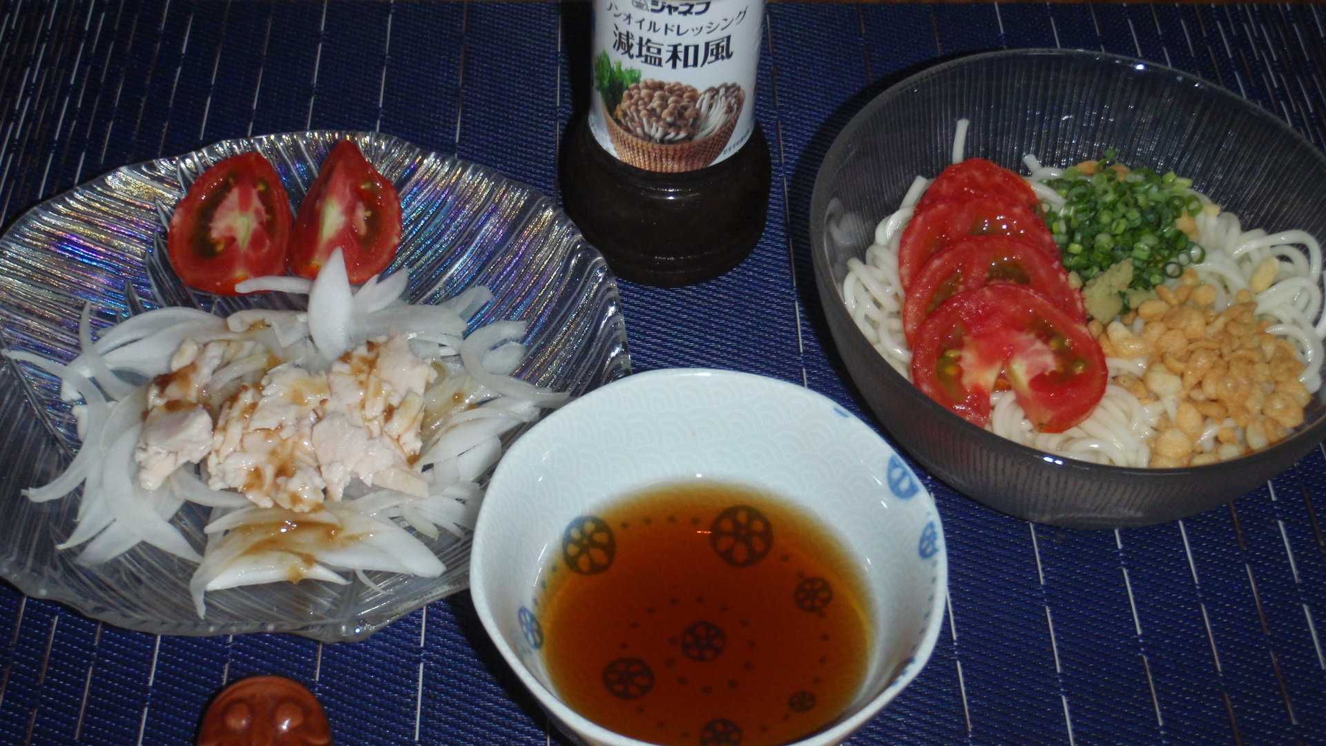 今週はあと30Km走らなければならないが、月曜日に走ってから中一日空けて、今日は走らなければならない。朝起きたら気温は26℃しかなく、天気予報を見たら夕方は33℃ある予報だったので、朝走れば楽になると思いながら、先週末のキャンプのキャンプの疲れなのか、キャンプから帰ってきた翌日に走った疲れなのか今朝は走れなかった。仕方がないので、夕方33℃の気温の中を走る。基本は高速の下を走るので、左右どちらかの歩道は日陰になるはずで、実際に今日走った行程の2/3は日陰だった。とはいえ吹く風は生ぬるいけれど。仕方なくなんとか10Km走るが、走り終えても気温はまだ33℃もあった。陽が陰ると風も少しは涼しく感じ、もう少し気温も下がっていると思っていたんだけどね。そんな日の晩飯は、昨日買ったアスパラと豚バラの在庫があるし、冷蔵ご飯もあるのだがなんか温かいものは欲さず、無塩細うどんを80g湯がき、揚げ玉と父が作ったトマトの半分に在庫のカットネギを飾る。オニスラと残り半分のトマトに、在庫していたサラダチキンを乗せて、今夜の動物性たんぱく質を稼ぐ。