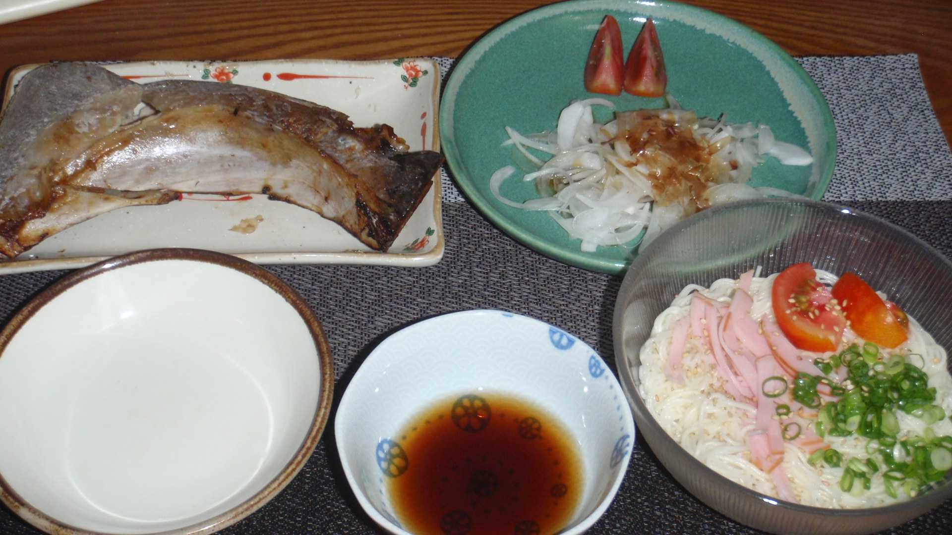 昨日は仕事で帰宅が遅くなり走らなかったが、そのつけはすぐに回ってくる。水曜日の夕方まで一回も走っていないのは、どう考えても間に合わないので今朝から走る。朝は忙しいので1時間しか走らないと決めているが、12km走っておかなければ間に合わないので、5時半過ぎには走り出す。その時間はさすがにまだ涼しくて走りやすかった。そんな今夜は炊いた冷蔵ご飯がないタイミングだが、わざわざご飯を炊くほどのことはなく、そうめんを80g湯がき、ハムとトマトにネギ・ゴマで食おう。昨日のマグロカマ(総菜)の残りが今夜の酒のアテになり、それでも余った分はおかずの一部になる。ひっくり返したので新品に見えるが、実際は身はもうあまり残っておらず、最終的にはほぐして盛る。