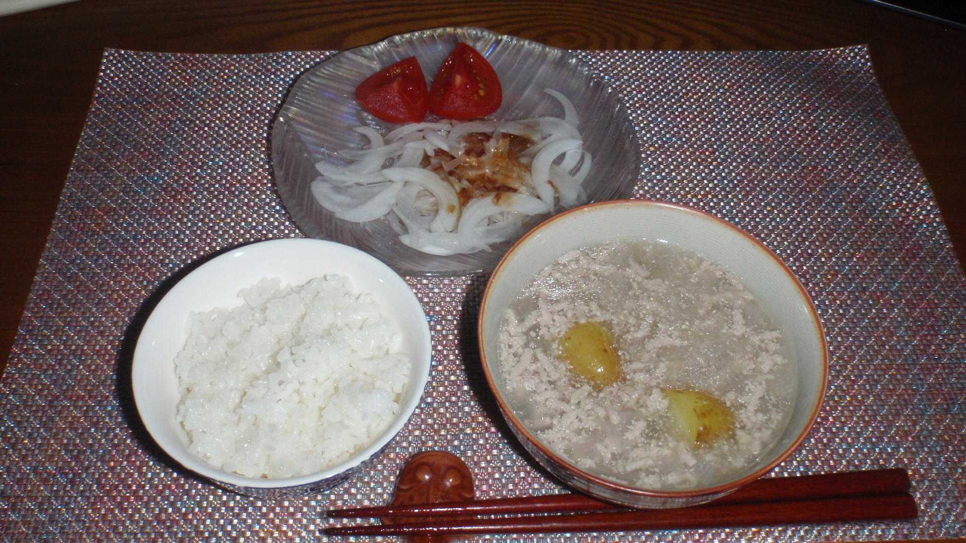 先日買った小じゃがいもがもう3個だけ残っている。今週末は家にいない予定なので、1泊とはいえ食材類は消費しておきたい。ダンボール一箱でいただいたタマネギもまだ残っているのだが、ニンジンは在庫がない。ニンジンの在庫があるならば、じゃがいも・タマネギ・ニンジンで、肉じゃが(鶏肉ならばうま煮)かカレー・豚汁体制だが、数日前にやっとニンジンを使い終えたばかりだ。じゃがいもとタマネギだけの使い道を考えた結果、豚ミンチを買って来て一緒に煮込む。冷凍していたショウガを擂りこみ、味付けは減塩料理白だしとみりんを各10cc。いつもはこれを片栗粉で固めると、塩分をすべて引き受けることになると自粛するが、さすがに見た目がショボかったので水溶きで固める。昨日の残りのオニスラとトマトの生野菜を添えて、定量+一杯(皆さんは読み過ごしてしまうだろうが、俺的には大問題)の酒を飲むとここにみそ汁までは・・・