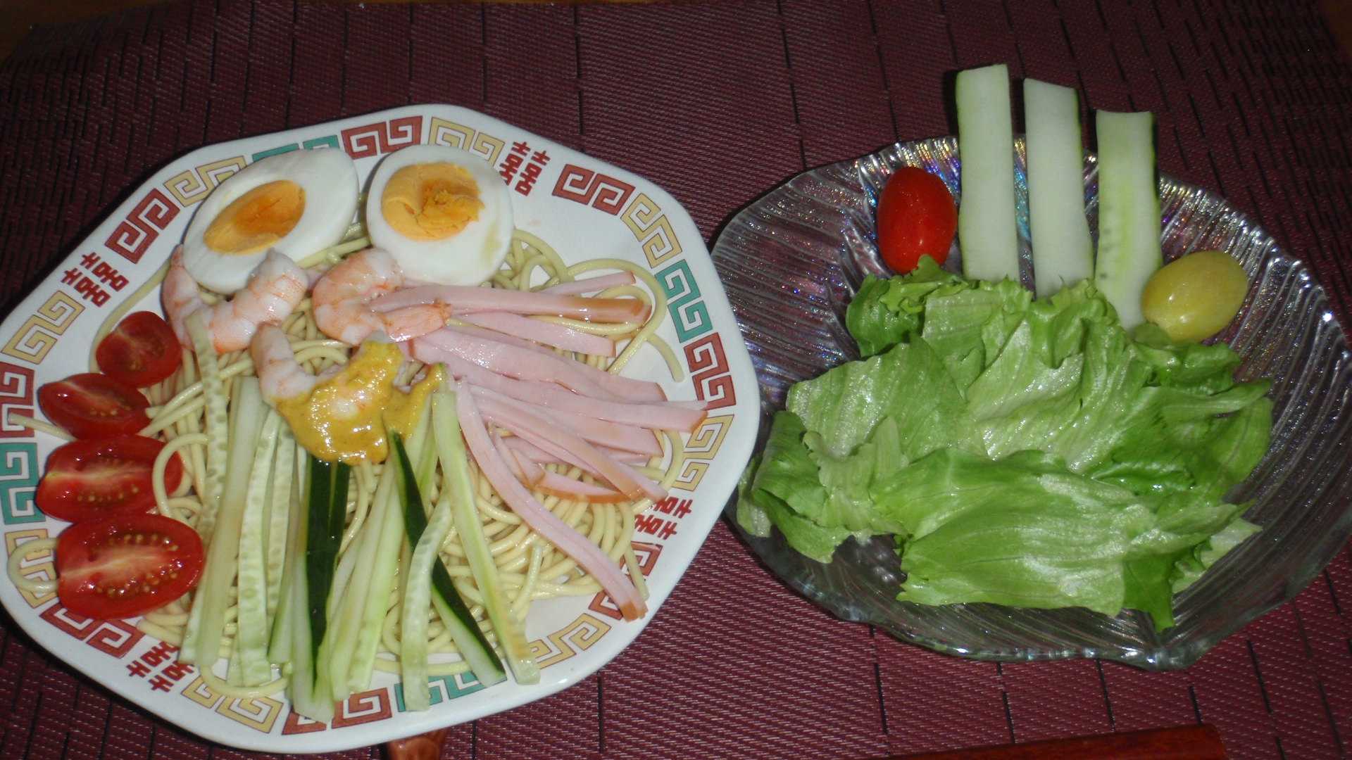 今夜は冷蔵ご飯がないタイミングだが、冷やし中華を食いたい気満々だった。その割には夕立が降って夜の気温は30℃を切っているのだが、もう冷やし中華体制だし米も炊いていないので、九州が誇る五木の中華麺85gを湯掻く。明日の朝飯の分と一緒にゆで卵を作り、父が作ったきゅうりと、在庫のハム・プチトマトにさっき買って来たボイルエビも飾る。粉辛子を練って、俺にも事情があるのでスープは減塩ポン酢をテロテロで使う。いただきもののタマネギの在庫はまだあるが、毎度オニスラではたいがい飽きるので、今夜はレタスを半玉で買って来た。確か半玉で5~60円程度(税抜き)だったかな。冷やし中華用に切って余ったきゅうりにプチトマトも添える。