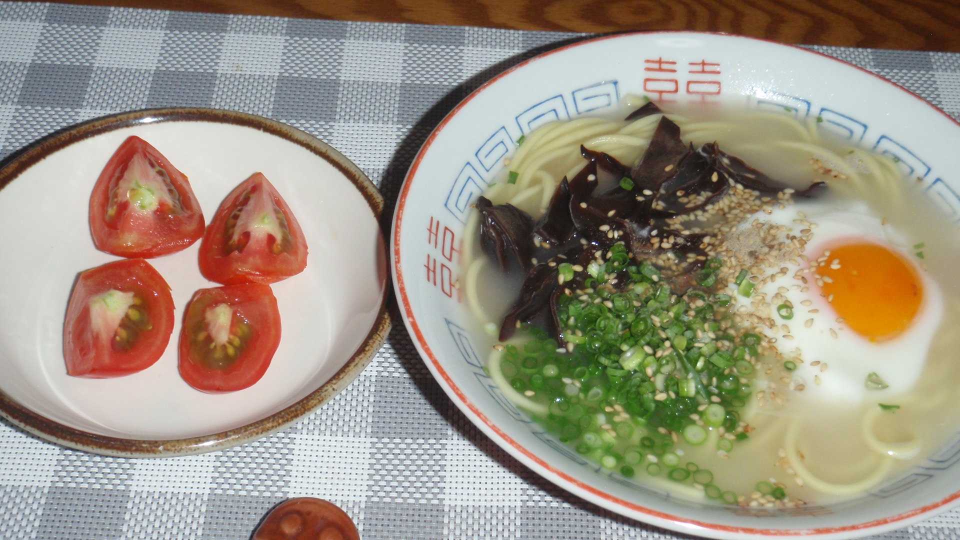 一泊二日のキャンプから18時ごろ帰宅して、さすがに疲労もありシャワーを浴びて酒を飲むと晩飯はそれほど必要ない。そもそも晩飯の食材を買っていないし。そういうわけで、在庫の九州が誇る麺メーカー五木の中華麺85gを湯掻き、俺にも事情があって半分ずつしか使わないマルタイ棒ラーメンの粉末スープの素が余っていくので、今回も一食分の半分で使う。ネギは一昨日うどんを作ろうと思って買って来た分が、結局うどんは食わなかったので丸々余っていた。トマトは父が作ったものをいただいた。