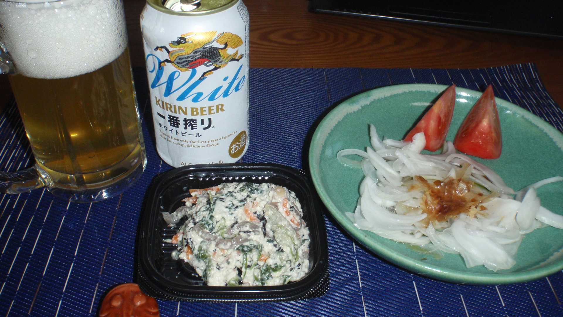 今週というか先週はあと4Km走らなければならなかった。4Km程度ならば当然朝の涼しいうちに走りたく、今日も6時前に走り出す。10kmずつしか走ってないとはいえ、今日で3日連続で走ることになるので、今日はさすがに4kmだけを走ろうと思っていた。ところが3日連続になると身体がもう諦めるのか、この3日で今日が一番身体が軽かった。ならば少し頑張ってみようと結局は今日も10Kmを走る。それでやっといつもの週間42kmだが、今の時期は週に36kmしか走らなくてもよいので、6kmは来週(今週)分となり来週(今週)は30kmでよくなった。そんな今日は昼から仕事だったのだが、夕方の行楽地帰りの渋滞に巻き込まれながらちんたら走りながら、今夜飲むビールがなかったことを思い出す。ところがスーパーに寄ったら、6缶パックの冷えた缶ビールは軒並み売り切れていた。そりゃあ、これだけ暑い週末はね。冷えていないものはあったが、俺は帰宅後すぐに飲むビールを欲している。1缶売りはよく冷えていたので、今日飲む分の一缶だけを買おうと棚を見たら、見かけない製品を見つけた。6缶パックを買うときには、外したらおおごとなのでチャレンジしないが、1缶単位ならば挑戦してみようか。ホワイトビールが白くないことは知識としてわかってはいるが、いちおうお約束なのでジョッキに注いでみた。若干色が薄いのかな?俺の舌は上等ではないので、2口・3口と飲み(食べ)重ねるとそれが普通に思えてくる。そこで飲むでも食うでも最初の一口の感想をそのものの感想としているのだが、ホワイトビールの最初の一口の感想は「めっちゃフルーティ」。たぶんホップのフルーティーさだと思う。知らんけど。今夜の酒のアテは、スーパーで見て回った結果これと言ったものを見つけられず、総菜の白和えとそれだけでは心もとなかったのでオニスラとトマトの生野菜。今夜は昨日作った肉じゃがを食うので、晩飯についてはこれと言って書くこともない。今夜は生野菜を酒のアテで消費した結果、晩飯の画は昨日よりもショボいし。
