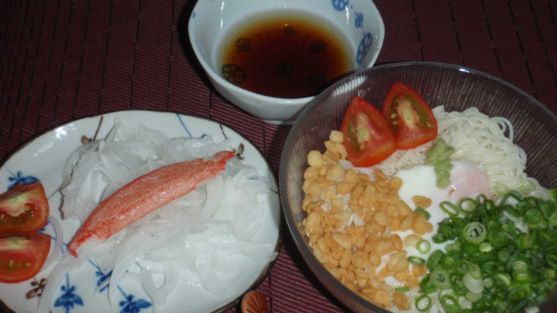 今朝も涼しくて、朝6時前の気温は25℃しかなかったが、一方で夕方は18時でも34℃という予報だった。今日は走るべき日だが、朝の方が絶対に楽だと、迷うことなく朝から10km走る。ところで、朝が明けるのも少しずつ遅くなってきている。そして今朝走っていたら、平地でも赤とんぼが群れていた。たぶんアキアカネだと思うが、走っている最中なのでよくは観察していない。平地でもアキアカネが飛び始めたら、少しずつ秋が近づいているね。さて、そうは言っても昼はまだまだ暑くて、今日こそはそうめんでいいかなと思う。80gのそうめんを湯掻いて、レンチンで作った温玉(風)と揚げ玉・ネギ・(父が作った)トマトを飾る。オニスラとトマトの生野菜に、カニカマを買って来たので添える。