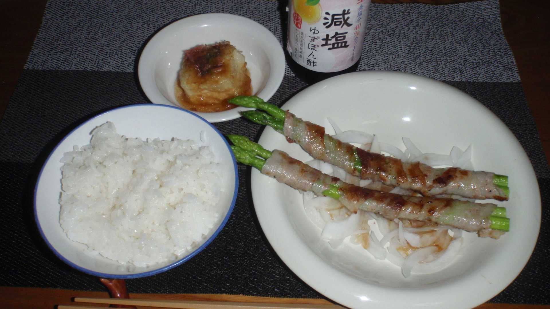 誰も間違えないと思うけれど、俺のブログで巻くと言えば毛バリではなくアスパラガスだ。いや、アスパラガスだけではないが食材の話だ。一昨日買ったアスパラガスと豚バラ肉だが、豚バラが思ったよりも短かったので、一昨日は豚バラもアスパラもカットして炒めた。アスパラは8本入りだったのでもう4本残っているが、一昨日と一緒では面白くないので、今夜はアスパラ2本を継ぎ継ぎしながら3枚の短い豚バラ肉で巻いた。コショウを打って寝かせておき(俺にも事情があるので塩は打っていない)、炒めてオニスラの上に乗せて減塩ポン酢を掛けて食う。一昨日炊いた冷蔵ご飯なので、アスパラ焼き飯などに加工することも考えたが、アスパラの豚バラ巻きに白ご飯がイメージ的に最善だった。さすがに汁椀も必要だろうと思っていたが、酒のアテに買った総菜の揚げ出し豆腐が1個余ったので、これを副菜ということにして、みそ汁まではいらないか。ちなみにこの揚げ出し豆腐は食塩相当量0.6g表記だが、出汁はほとんど摂取を回避するし。