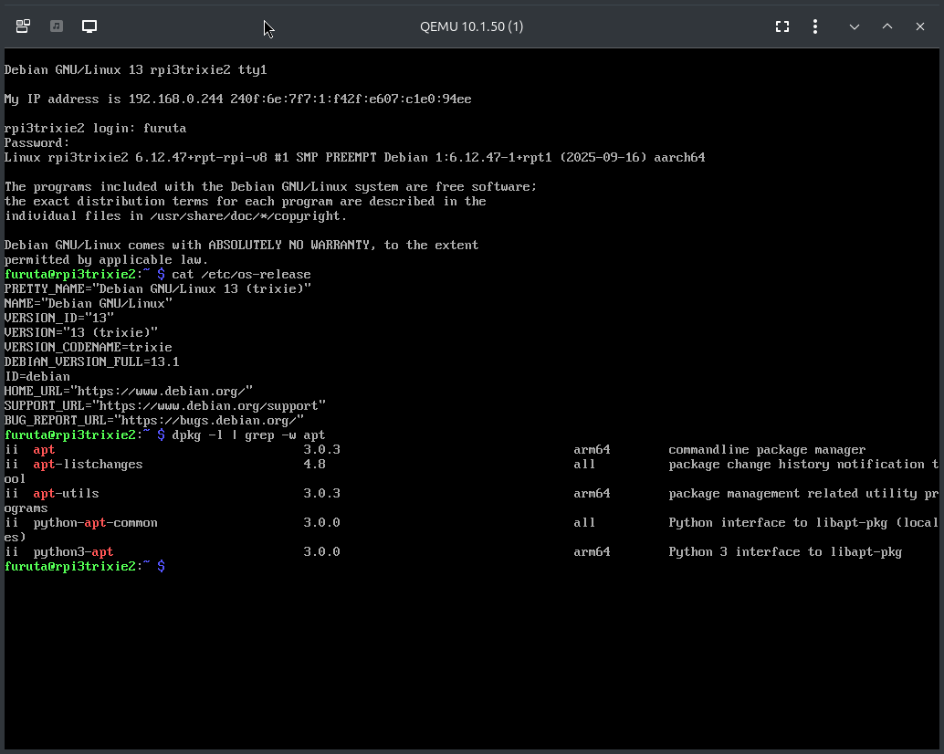 Raspberry Pi OS が更新されて Debian 13 "trixie"になった。QEMU 上で上手く動かせてい…