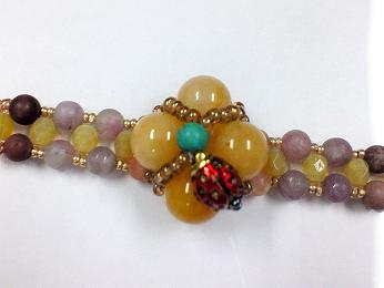 前回、オレンジの石を使って作ったてんとう虫ブレスレットオレンジの石はこれを使用【半貴石・模造石ビーズセット】5連スタッカーS入り(1本)その他、このお店↓で買ったキットの余りのビーズを寄せ集めて作りました。ビーズパーツ販売アクセサリー通りてんとう虫ブレスレット第2弾は、革紐とビーズで作るブレスレットのキットを使って作りました!!って言うか、このキットにてんとう虫をつけただけです(;^_^A アセアセ・・・このキットは近所の手芸用品屋さんで800円くらいで購入しました。楽天市場で探してみたけど、みつけられなかったです(´・ω・`)ションボリ最初に作った方の、てんとう虫ブレスレットは、私の完全オリジナル作品なので、一日がかりで作りましたが、このキットは30分で出来ました。ものすごく簡単でした。このキットのほぼ説明通りに作ったのですが、説明通りに作らなかったがためにちょっと失敗(>_<)私は、手首がすごく細いんです。体は痩せてませんけど(^▽^;)たぶん骨が細いんです。だから、作り方を無視して3cm短く作ったんです。そしたら、サイズはちょうどよくなったけど、ビーズが多すぎるような気がするんです。3cm短くなった分、ビーズが密集し過ぎてしまうので、作り方より少しビーズを減らせばよかったです。またこんな感じのブレスレットを作る時は、気をつけようと思います!!