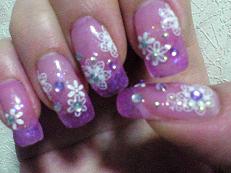 いつもと変わらず、ネイルシール頼りのネイルアート。雪白(アセトンで落とせる真っ白のジェル)に出会ってからフレンチばっかりしてたので、ちょっとフレンチ飽きてきた(;^_^A アセアセ・・・ネイルシール、キラキラの石、ブリオン、全部百均で購入。使ったジェルはフォーカスカラージェル税込・送料別3,150円(ネイルチップ工房)これを薄~く塗りました。しっかり混ぜると、かなり濃い紫です。(見本より赤っぽくて、ラメはもっと細かくてこんなに白く光りません。紫の延長線上の色に光ります。)このジェルは、素人の私でもムラにならず塗りやすかったです。次は、爪の先だけめっちゃ濃いのを塗ってみようかなぁ?グラデーションにしても良さそうです♪以前、この店の色付きのジェラッカーを買ったら見本と全然違って大失敗したけど、これは画像と説明文からイメージしてた色が届きました。他の色も買ってみようかなぁと思いました!!