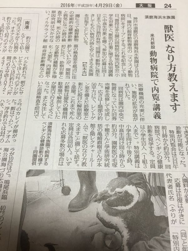 ■獣医 なり方教えます 須磨水族館が園内の飼育動物用動物病院を作るのを記念して 「獣医 なり方教えます」という講座を開くというのが 今朝の新聞に載ってました。 獣医さんに限らず実際に働いておられる方から こういうお話を聞けるって素敵なことですよね。 詳しくはこちらです http://mainichi.jp/articles/20160427/ddl/k28/040/349000c