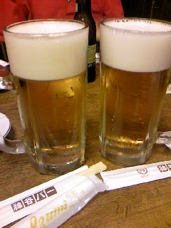 ジョギングした後は、必ずビールを飲むのが習慣になりつつあります。しかもこれは嫁さんの提案。私は不本意です。(嘘つけ!)しかしこのビール、本当に旨い。一応走る前に少しの水分補給をしておりますが、走り終えると汗はダクダク、喉はカラカラになります。そのカラカラの体に一気にビールを流し込むと指の先まで炭酸が染み込んでいくようです。そのことを何人かの友人に話すと、「いいねえ」とは言いながらも「わたしもやりたい!」とは言われませんでしたが、ひとり「痩せたくても飲兵衛」のママさんが食い付いてきました。昨日早速一緒にランニングして弊社でぐいっと缶ビール。「はああ、旨い」・・・・・ストイックに酔いしれたり、自分の体が締まっていくことに悦びを見つけ、体を鍛える辛さを快感に変える方法もありますがこのように辛い後にご褒美をセッティングすることで辛いことを乗り越える方法も時には必要なんでしょうか。私の構想なのですが、着替えと少しのお金を持ってひたすら走れるところまで走り、「もうだめだ。走れない」となったら近くの飲み屋に入り生ビールを飲む。そして電車で帰宅。名づけて「戦艦大和ジョギング」。じつは何かの記事で、そういう走り方を楽しんでいるグループのことを読み、すごくいいなあ、と感じました。私の構想って言いましたがオリジナルじゃござんせん。とりあえず今のところ賛同者は嫁さんだけ。コースも日時も不明です。面白かったらレポート書きます。