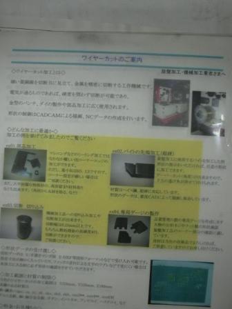 月曜日に「そうだ。請求書に宣伝入れてみよう」と思い立ちました。ワイヤー放電加工の宣伝をして、もっと詳しく知ってもらうことから、実際にお仕事につながる願いを込めて、チラシを作りました。思い立ったら即実行がテーマですので夕方に思いつき、仕事が一段楽した後、写真を取りまくりました。終わったのが午前1時。なんとか出来ました。そして今日、月末組のお客さんの請求書に同封。発送しました。コンセプトはこういうことです。NC旋盤加工やマシニングを使って機械加工をしているお客さんがいます。そのお客さん方は、旋盤やマシニングについては明るいのですが、ワイヤーカットや放電加工については実はよく知らない方が多いのです。その理由なんですが、あくまで推測なんですけどワイヤーカットや放電加工って言うのは一品加工が主体の仕事である、金型製作などに広く普及し、量産加工を追いかける機械加工とは、少し異質なんです。(と、思います。念のため)プレス金型でも、絞り加工を中心にやっている場合、へら絞りとかの異業種などは付き合いがあるけれども、ベンダーやタレパンを使った板金屋さんとはあまり・・ていうかうちの場合はお付き合いがありません。板金加工とプレス加工は加工方法はそっくりですがお客さんの色合いが違うというか、そういうことなんですね。接点が薄いというのでしょうか。まあ、そういう感じです。昨今は量産加工とは言っても、あらゆる業界で多種少量化が進み、少ない製品数に多くの付加価値を組み込んだ、難易度の高い、工程数のかかるものが増えてきています。そういう場合、一品モノ、あるいは少量生産が主体のワイヤーカットや放電加工との距離が従来の機械加工と近くなってきているのは事実なんです。加えて、現在の大不況時には、仕事といえば安く、短納期で、難しいのがおかしくないので、「値段が高い」のイメージが強いワイヤーカットの本当の理解を含め、仕事へ役立てて欲しいと願ったわけです。弊社の機械加工分野のお客さんのうち、ワイヤーカットのお仕事を頂くのは、現時点で10%くらいです。これがせめて50%になれば、「今ワイヤーの仕事薄いな~」の状況は軽く脱します。内容を毎月詳しくしていって、チラシ配布を続けようと思ってます。