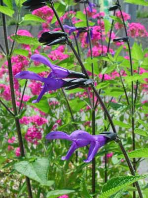 チョロギを梅酢漬けにした赤い塊茎は、お正月のお節料理に添える目出度い食べ物。 チョロギの栽培は以前から興味を持っていたが、種塊茎の値段は意外に高く、ちょっとテスト栽培するのにちゅうちょした。しかし誰が思いついたのか、4粒ほどをポットに植え、芽を出させて売っていたので、買ってきた。 生長した草姿は、近くにあるシソ科のサルビア・グアラニティカ(写真下・紫花の植物)とそっくり。葉っぱなどは、色調がちょっと違うだけで、まあ同じと言ってよい。 しかし花の色は淡いピンクで、花の着き方はふつうのシソに近い。小さい写真ではっきりしないが、葉の上に虫が1匹。ゾウムシのようだ。バラゾウムシだったら、わが家の大敵!