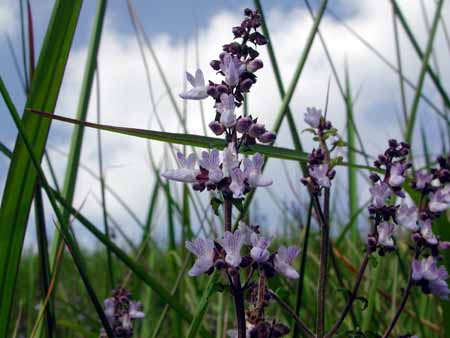 花茎が四角で、シソに近い植物であることは間違いない。しかしそこから先が・・・? それにしてもほんとうに面白い花形!ピンと立った耳には紫の模様が点々と・・ほかの花弁は1つにまとまって顔を作る。なんと、拡大写真の下の方には1つだけ、おちょぼ口を開けた顔がある(少し見にくいが)。 花たちは1軒屋の近くの土手に連なっていた。しかし園芸植物が逃げ出したものかどうかは定かでない。
