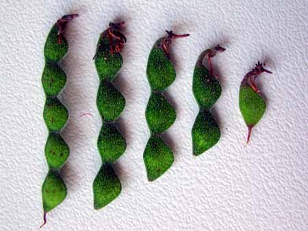 近所に多いこの植物は、ほとんどの点で図鑑のヌスビトハギに合致するけれど、疑問の点も少しある。(花の写真は9月23日にアップ) ここで疑問を書いていますように、正しくはヌスビトハギではなく、アレチヌスビトハギのようです。謹んでお詫び申し上げます。そのつもりでお読みください。(10月27日) そこへ新たな難題。図鑑を見ても、ブログの写真を見ても、ヌスビトハギの果実は2個1組で、間がくびれている。ところが、そろそろ果実が熟しているかなと出かけてみると、果実はまだ緑色だったが、「豆」の数が1.2.3.4.5といろいろあるではないか。これでは「盗人の足跡」という話はどうなるの? しかし、ペアの果実が多数を占めればいいじゃないのという意見もあるだろう。そこで4本ほどの花序から、50個ほどの果実を集めてみた。それが下の写真。豆が1個の果実が14、2個が12、3個が16、4個が10、5個が1で、ペアはぜんぜん多くない。奇数と偶数を比べると、奇数の方が多い。 ところで色は緑でも、莢の「鉤」は立派に育っていて、果実が手に付くは、果実同士が付くはで、写真の撮影に苦労しました。