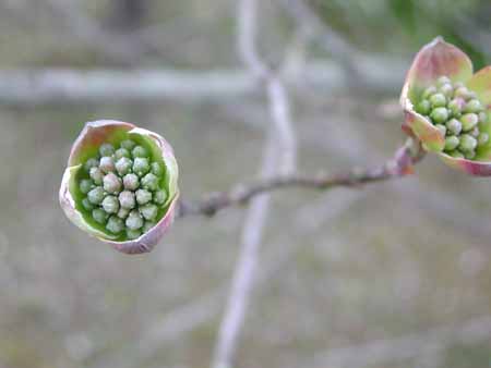 公園でつぼみが集まったようなものを見かけたとき、それがなんだか見当もつかなかった。葉っぱもなかったし、大人ほどの高さの木が横に広がっていた。家に帰って調べても、要領を得ない。 決心して、10日後、同じ木を見に行く。な~んだ、ハナミズキではないか。 ハナミズキの「花」って、総苞片が伸びる前は、こうなんだと初めて知った。それにしても灌木状の樹形は人心を惑わす。街路樹とはまるでイメージが異なるのだから・・