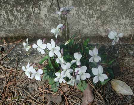 3月28日に、菫色のスミレの一家を話題にした。それから20日ほどしか経っていないものの、もうソメイヨシノも葉桜になり、春が当たり前となってしまった。 今日は白いスミレの一家。これも2,3年前に知り合った。その時は1/3くらいの家族数だったと思うが、いまはこの長い行列。自転車でも、気をつけないと見落とすぐらいだから、いつまでもご安泰でしょう。 スミレの名前を決めるのは容易でない。そういうことは抜きにして、密かに楽しむことにしている。