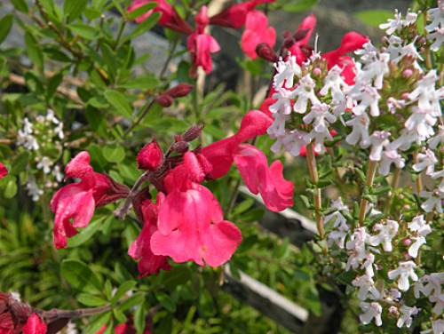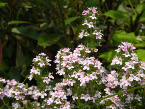 タイムはハーブの1種だが、わが家では食することがない。株分けでふやしたりして、庭のあちこちにある。それが今、花時。 ごく小さい、密集した花だから、立った姿勢で眺めると、こんもりした花の集団。ピンクと白色を比べれば、ピンクの方が圧倒的に見栄えがする。 しかし思いっきり腰を落とすと、小さいながら花びらや花糸が見えてくる。