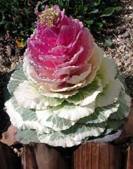 今年の葉ボタンはどうでしょう?寒さのせいか、鳥が増えたのか、葉ボタンの葉っぱは(とくに緑色のところを)さんざんに食べられてしまいました。友人はヒヨドリだろうと言うのですが、残念ながら犯人を目撃していません。ということで写真は貴重なものになりました(笑)。