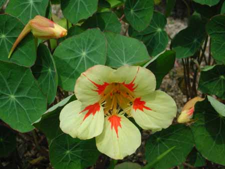 葉っぱがハスに似て、水玉がその上でコロコロ転がるから、ノウゼンハレンの「ハレン」。なんか可笑しくなります。
