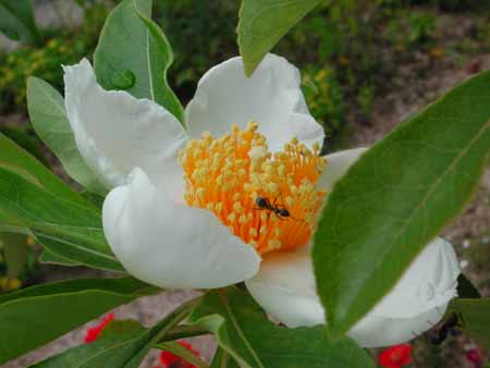 それから3年、小さい苗もだいぶ大きくなりました。そこで気になったのが、日本のナツツバキとの違い。見たところ、葉の幅が狭く、雄しべの色が鮮やかです。