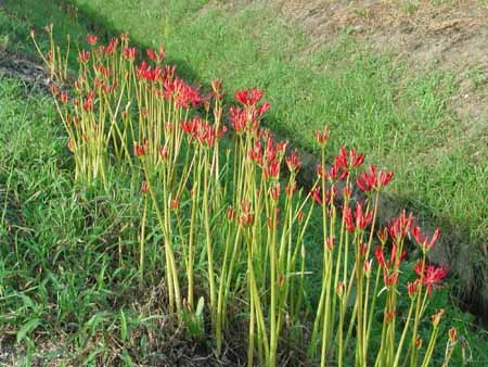 近所については、用水路沿いとか、ヒガンバナの球根が隠れている場所を覚えています。農家の方もご存知なのか、9月上旬までに観賞に邪魔な雑草を刈ります。