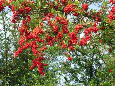 追記:このピラカンサは、タチバナモドキに近いです。ただ、タチバナモドキは橙黄色の実をつけるとしている本もあります。