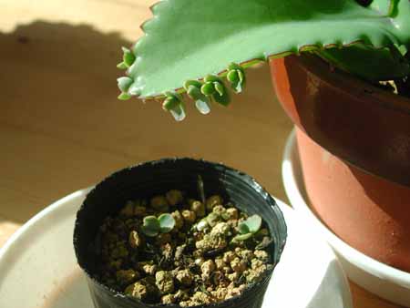それが、育つ、育つ!2ヶ月で写真のようなことに。葉の縁に生まれた子株が、ポロポロと落ちます。それを土の上に載せてやると、なんかうまく落ちついてしまう。生育開始!これじゃ、ネズミ算です。いや、それ以上かも・・?