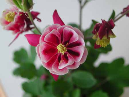 オダマキを取りあげたが、庭植えは最初の葉っぱがやっと出たくらい。とうぜんのごとく写真は、温室育ち。ウィンキーダブルという品種は知らなかったけれど、色が渋くて、上向きに咲くのが見やすい。