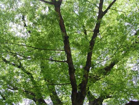 ちょうど新緑の季節、若葉が青々としていた。無数の葉っぱに地中の水を集め、配分する「ポンプと水道」の仕組みは、どうなっているのかと思ったりした。200年もの長きにわたって、「動脈硬化」を起こしていないな!