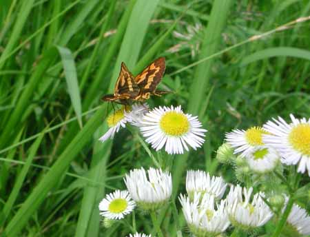 ヒメジョオンの「花園」にキマダラセセリが「着陸」していた。着陸と表現したのは、止まった姿がジェット戦闘機を連想させたから。これで真っ黒だったら、ステルス戦闘機ですね。