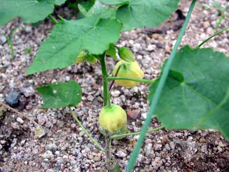 サカタのカタログによれば、アブチロン「ベラミックス」は播種後100日、草丈20cmから咲き出すという。実際、写真の「1番乗り」は、いっしょに写っている1本のチャイブの葉から分かるように、この大きさでいっぱい、黄色い蕾を着けていた。