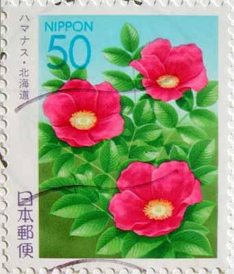 それは「ふるさと切手」の名の下に発行された、47都道府県の花・ハマナス(北海道)だった。発行は意外に古く、1990年4月。原画作者は池上啓一(洋画家)だという。ついでにいうと、使用済み切手の評価は60円とか(未使用なら350円)。ふ~ん・・