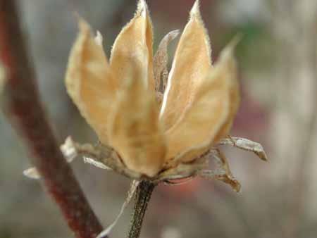 しかしムクゲの木が動き出す気配は全くない。枝の所々に、去年の実が残っている。むろん中身は、とっくに北風に飛ばされて空っぽ。色白の殻にフォーカスする。ふちが光り、細かい毛が並ぶ。この毛はなんのためなのかな?