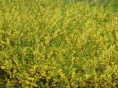 公園でレンギョウを完全に好き勝手にさせた例は見あたらないのだが、これは面白い試みだと思う。まずレンギョウを平面状に植え、高さを低めに揃えておく。たぶんその後は自由にさせた(手を抜いた?)のだろう。なぜって、中に人が入っての剪定はできないのだから。