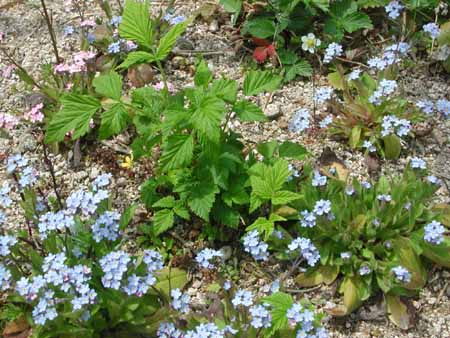 周りのワスレナグサは自然に生えたもの。今ごろが一番可愛い。やがてぼうぼうになって姿が崩れてくるから、ラズベリーの花が咲くころ、抜くことになるかもしれない。