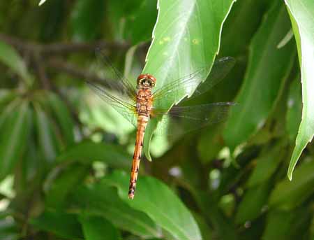 写真のトンボは、羽化したばかりだったのだろうか。なんとなく行動がゆったりとしていて、デジカメの接写モードでここまで接近することができた。そして羽は驚くほど透明だった。羽には参考になるような模様がほとんどなく、シオカラトンボの♀というムギワラトンボあたりが、正解なのかな?