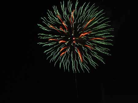 写真の花火でも一本一本の光道が、揺れている。しかしこれがカメラの悪戯かどうかはわからない。ちょっと悪魔っぽい、巨大な「ダリア」が夜空に開いた。