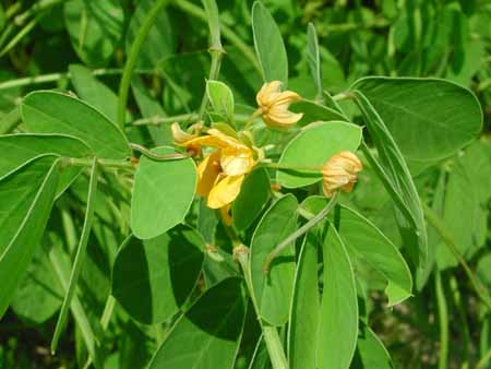 一見したとき、記憶に残るのはその果実。莢インゲンに似ているが、棒状ではなく、カールした果実がいっぱい成っている。ただ莢はインゲンより細い。