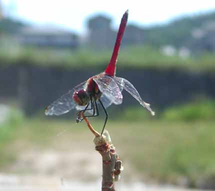このトンボももうだいぶながらえたのか、透明な翅が波打ち、端がちぎれている。世界体操選手権は終わってしまったけれど、トンボくん、足ならぬ、シッポを跳ね上げている。あれっ!足が1本足らないかな?