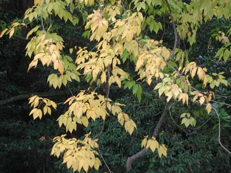 黄葉の中では、写真の木が一番清々しい。一昨年、市内の蚊無峠で撮ったもの( こちら )も同じ樹種ではないかと思うが、イヌブナあたりだろうか。