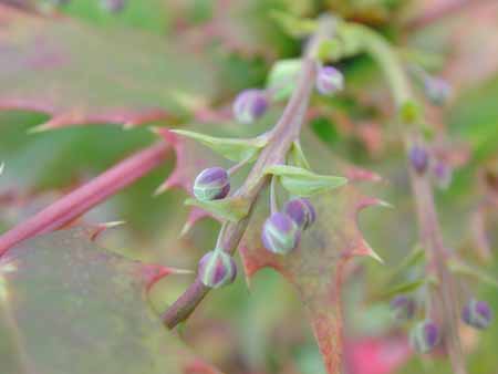 ヒイラギナンテンの花は黄色い。しかしこのつぼみは紫色を帯びている。それがふつうなのか、日陰で寒いからか。