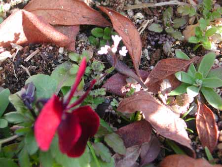ビオラの側に白花の、小さい、小さい野草を発見した。寒さのせいか、草姿が超ミニ。去年もトップを切って咲いた野草だが、マルバコンロンソウの花に見える。