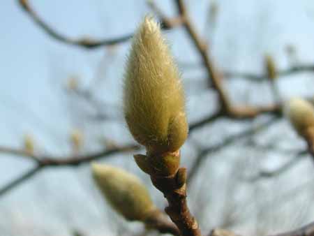 しかし他の樹では、フサフサとした和毛(にこげ)をまとった花芽がいっぱい。いつものことながら暖かそう。でもよく見ると、脇腹には、どれも1枚の「添え物」が付いている。コブシの花の下に特徴的な1枚の葉っぱも、今は和毛をまとっているのかな?