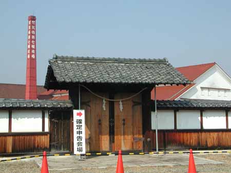 写真は西条税務署の臨時会場で「お客さん」をお迎えする門。もっとも矢印のとおり、車は右側にある駐車場へ。ここは昔、賀茂鶴酒造の第七醸造場(吉富蔵)として使われていた場所で、建物の一部が残っている。