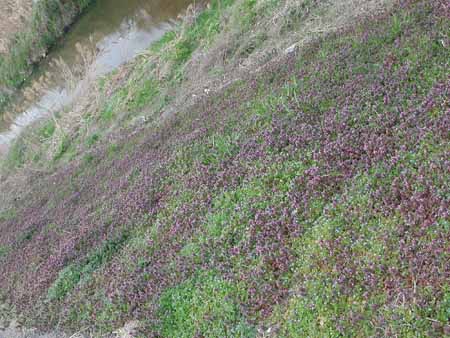 当地で春の到来を知らせる野草は、ホトケノザとオオイヌノフグリ。今年は冬が寒かったので、ダラダラと咲かず、パッと花開いた。そして次に来るのが、このヒメオドリコソウだろうか。近年、川の土手に多い気がするのは、気のせいか。