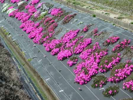 雑草防止シートを張ることによって、除草するだけでなく、シバザクラの花を楽しむ。シートには透水性があるということだから、シバザクラは干からびることも、蒸れることもない。(春は根元が暖かい)